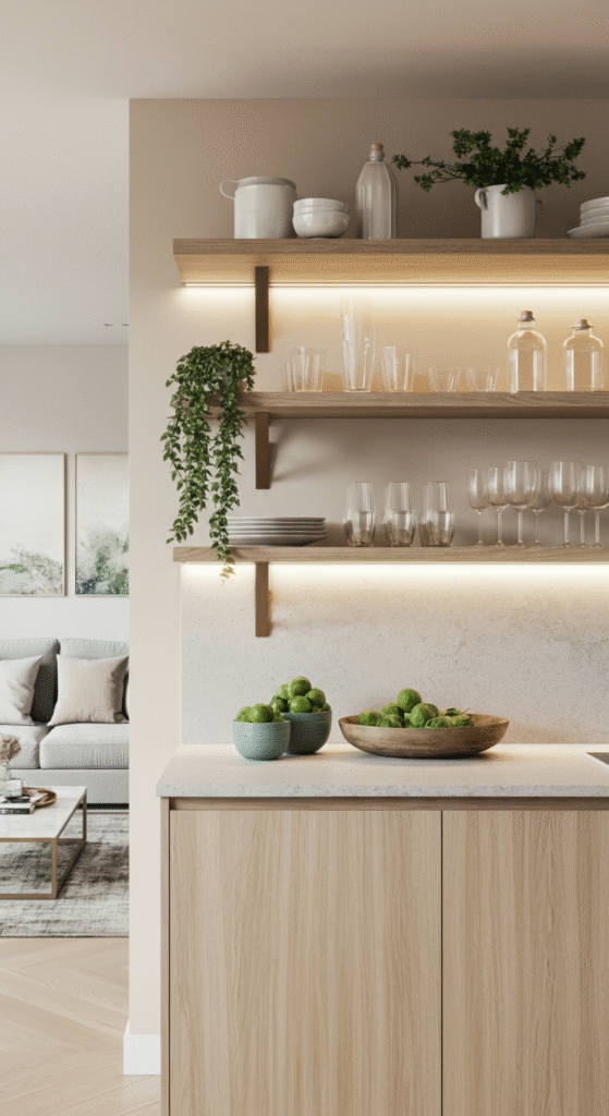 Instead of hiding away your kitchenware, display it on open shelves that complement the design of your living room. This creates a cohesive, curated look that merges the two spaces.