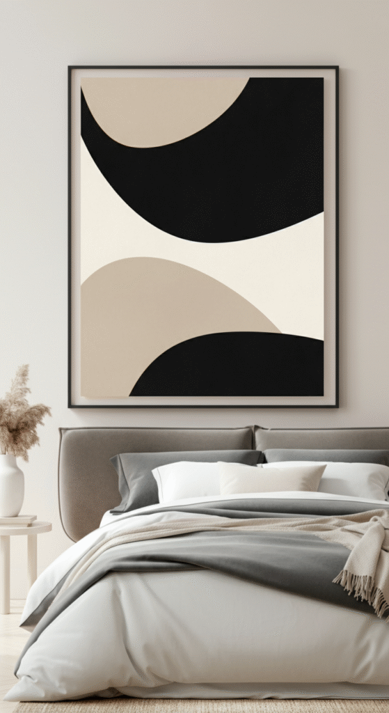 Modern bedrooms look great with minimalist abstract art, geometric prints, black and white photography, or vibrant abstract pieces. It’s all about finding a piece that complements your style and creates a balanced atmosphere.