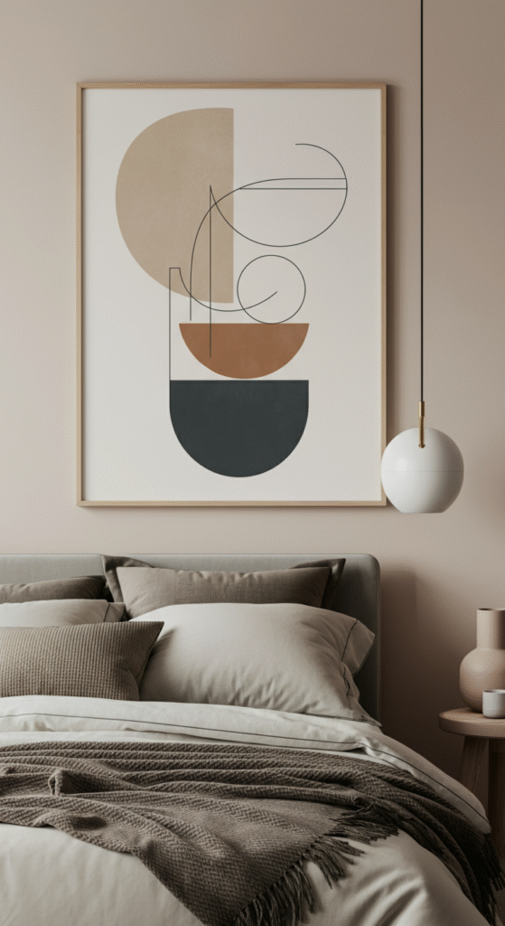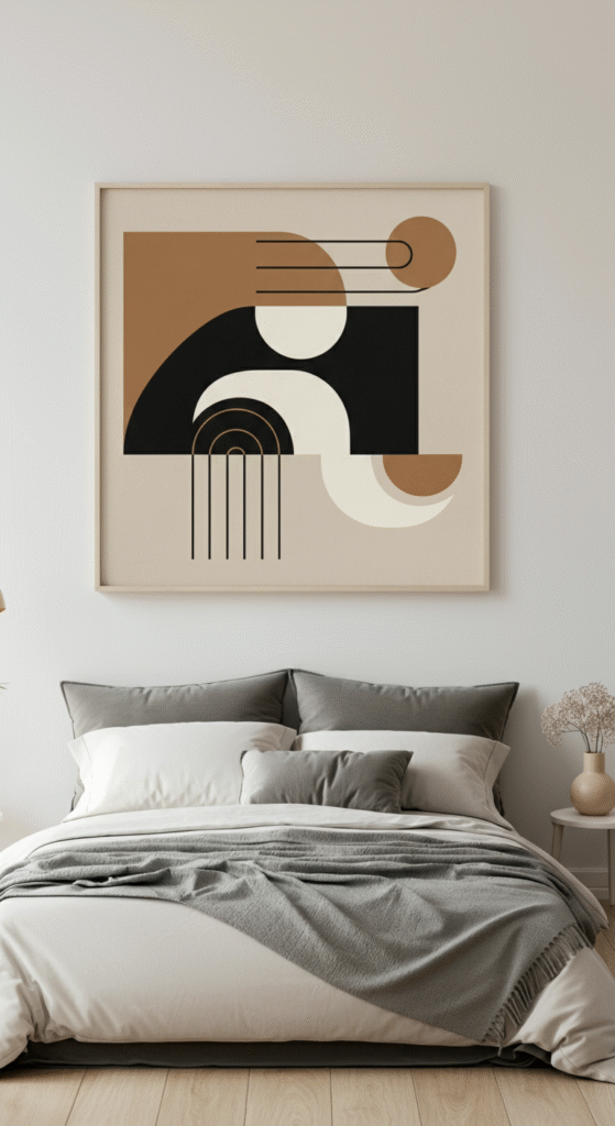 Mid-century modern art is effortlessly stylish, offering a blend of vintage charm and contemporary appeal. Whether it’s a minimalist landscape or a bold abstract piece, this style adds a touch of sophistication to any bedroom without feeling overly formal.
