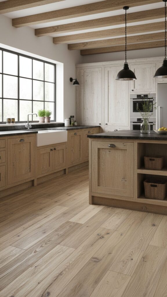 - Select a “distressed” or “reclaimed” wood style in a light oak or whitewashed tone.