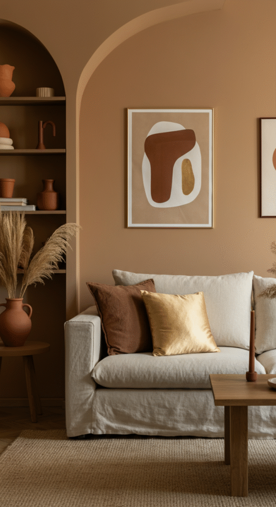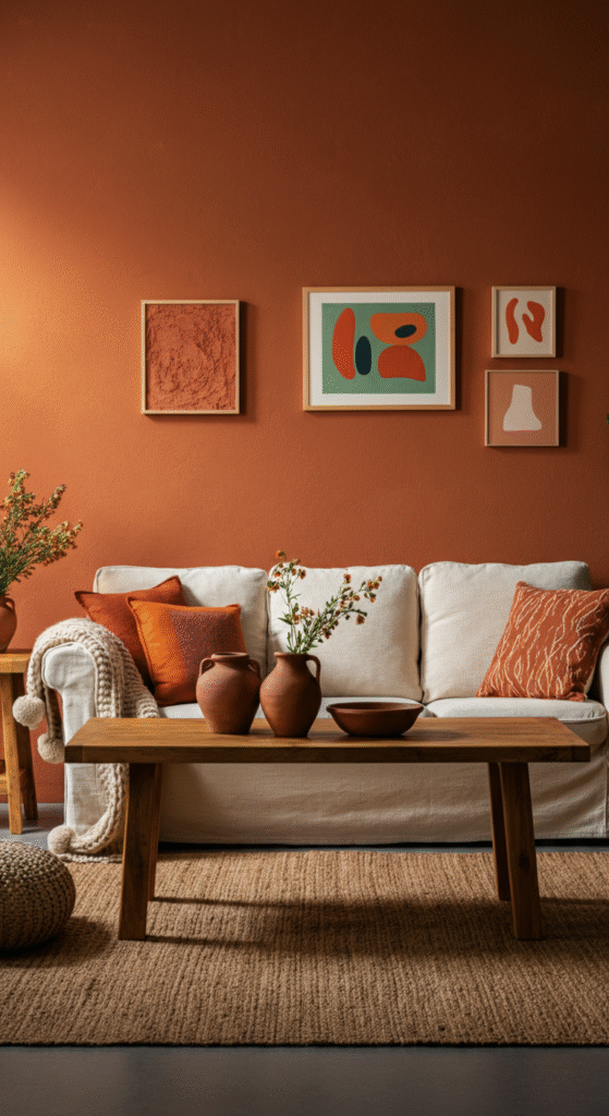 Terracotta is another earthy color that’s rising in popularity. It brings warmth and depth to any living room, creating a cozy, inviting space. The warm orange-brown hues of terracotta can make your living room feel grounded and welcoming, especially when paired with modern or bohemian decor.