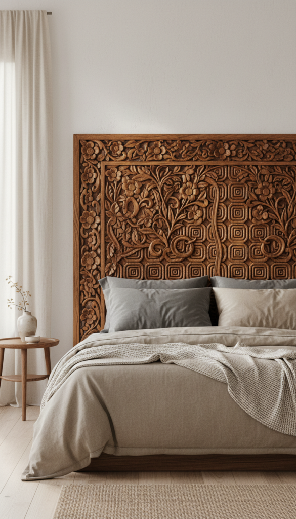 Wooden headboards with intricate carvings are a staple in Indian decor, often showcasing detailed motifs inspired by nature, mythology, or geometric patterns. These headboards bring both warmth and a sense of timeless craftsmanship into your bedroom.