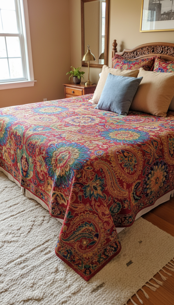 An Indian tapestry can act as the centerpiece of your bedroom. Rich in colors and patterns, these textiles often feature elaborate paisleys, florals, or animal motifs. They’re versatile enough to serve as wall hangings, bed spreads, or throw blankets.