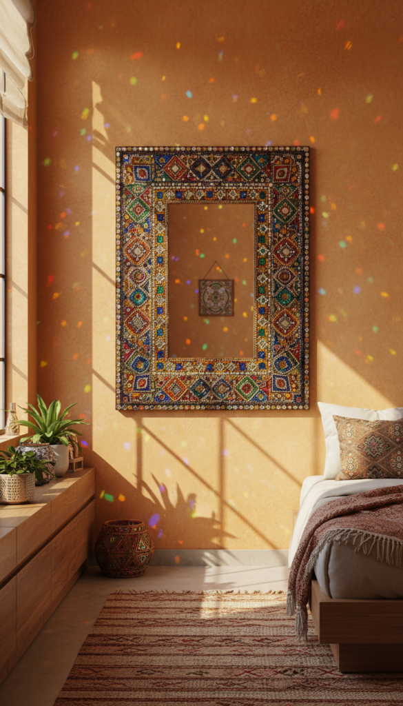 Mirrors with Rajasthani embroidery or mosaic mirror work are a stunning way to add an Indian touch to your room. These mirrors, often framed with beads and mirrors, not only help in reflecting light but also bring a lively and festive atmosphere to your bedroom.