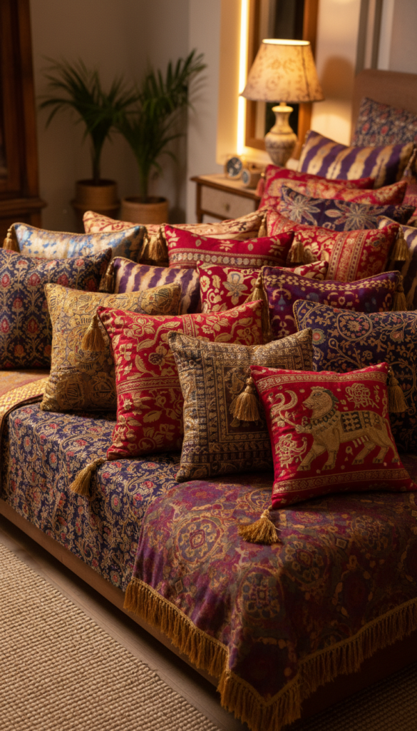 Interestingly, in many Indian homes, cushions and pillows are seen as essential for creating an inviting and comfortable space. Layering different sizes and colors can offer a cozy feel while adding vibrant colors to your room’s aesthetic.