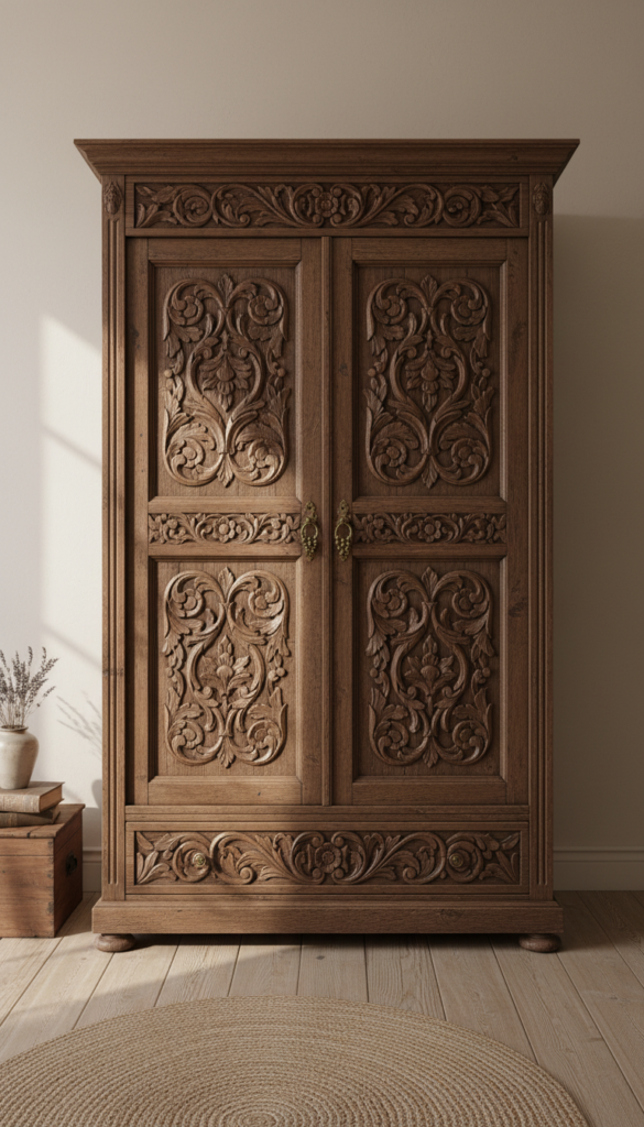Antique-style wooden furniture pieces such as side tables, wardrobes, and chests can create a striking contrast in a modern bedroom. The vintage look, with worn finishes and rustic charm, adds a unique touch that radiates history and tradition.