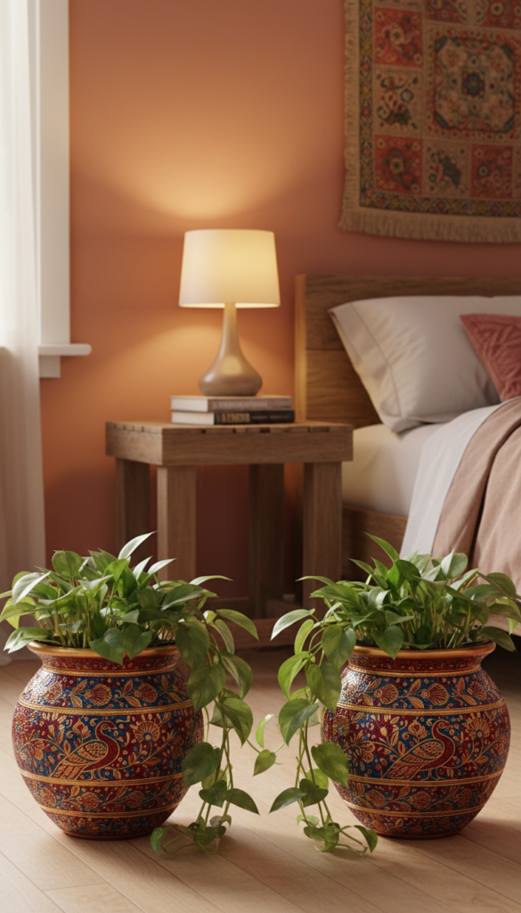 Hand-painted ceramic pots and vases featuring traditional Indian designs can add a pop of color and sophistication to your bedroom. Whether you choose terracotta, porcelain, or stoneware, these pots make for beautiful planters, or can simply be decorative items on your shelves or side tables.